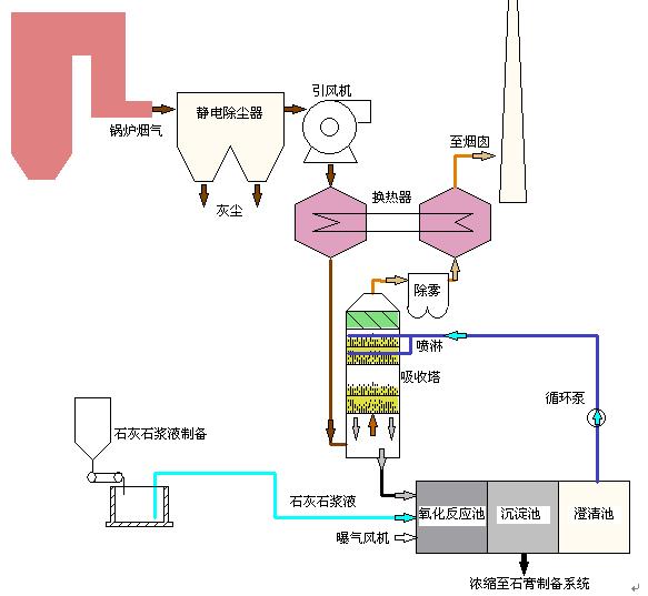 一、濕式石灰(石)/石膏法煙氣脫硫技術,其工藝流程圖如上: 鍋爐煙氣在吸收塔內與石灰(石)粉形成的漿液進行逆流接觸反應。吸收塔下段低PH值有利于氧氣和石灰石溶解,上段較高PH值有利于吸收反應,提高脫硫效率。