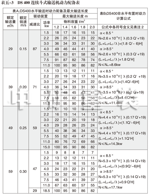 1、DS 400連續(xù)斗式輸送機(jī)動力配備表